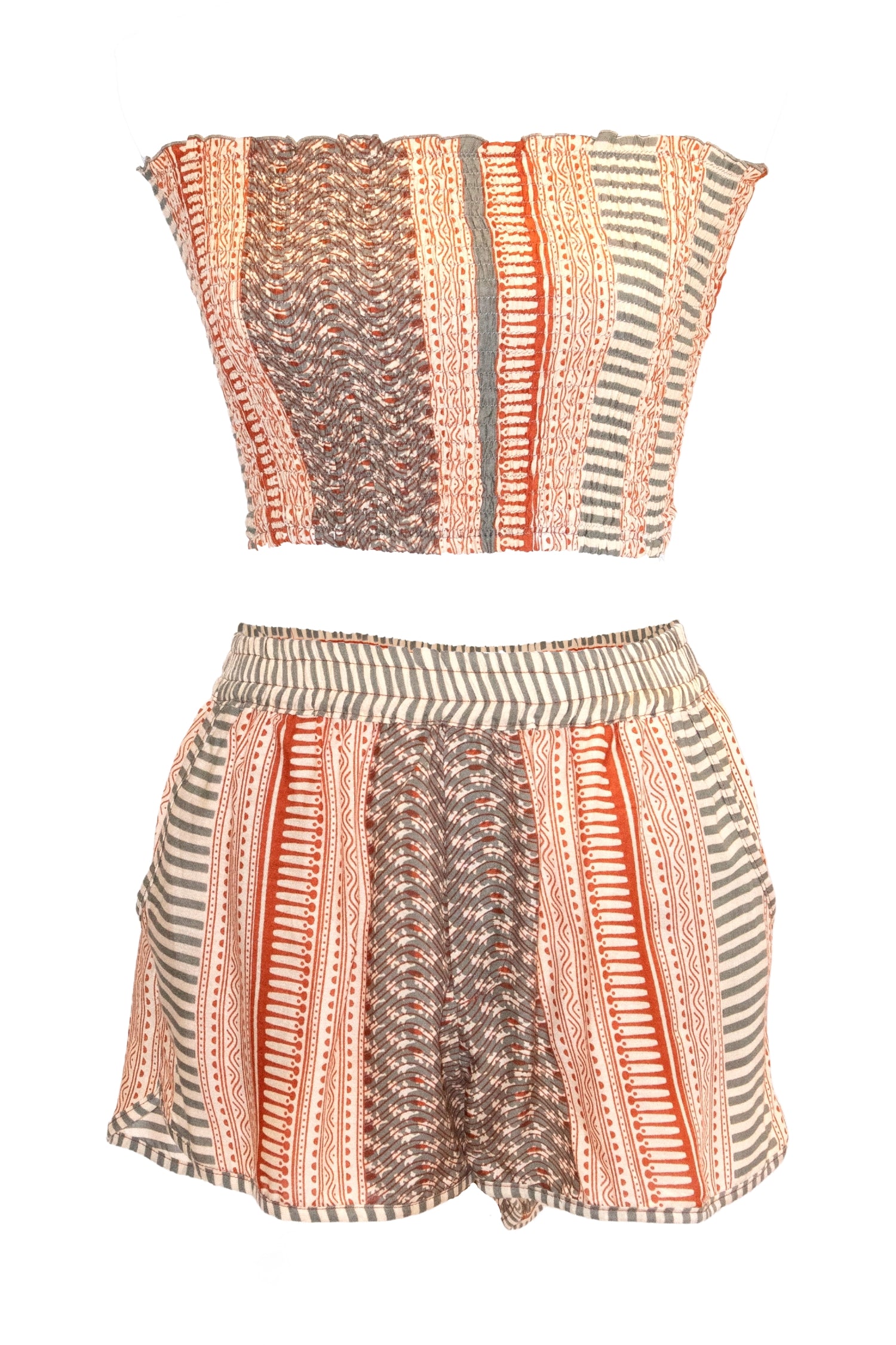 Style: Two-piece set featuring bandeau top and matching shorts. Pairs seamlessly with coordinating kimono top.