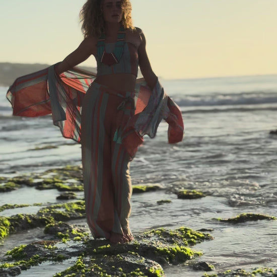 Style: High-waisted wide-leg trousers with relaxed flow. Pairs seamlessly with coordinating kimono and bandeau tops.