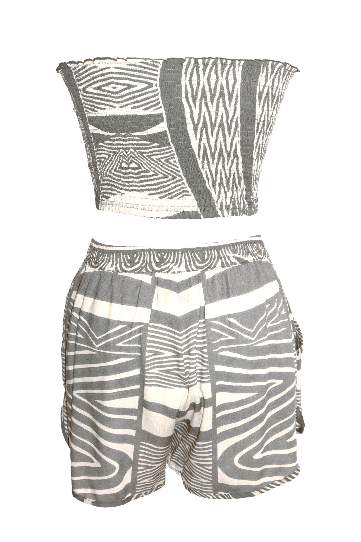 Style: Two-piece set featuring bandeau top and matching shorts. Pairs seamlessly with coordinating shirt.