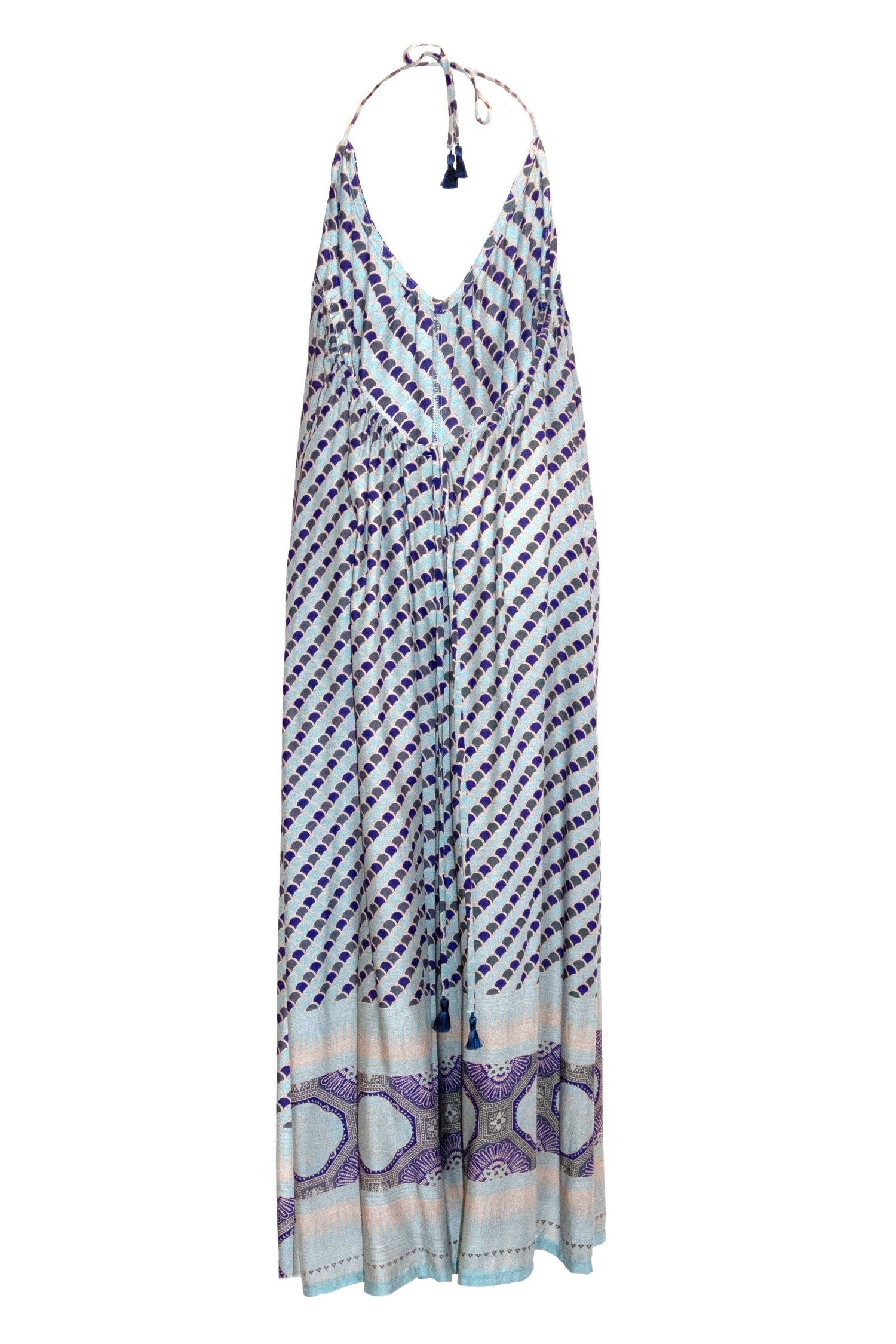 Style: Halterneck tie jumpsuit with height-adjustable straps to the front and back and tassel accents.